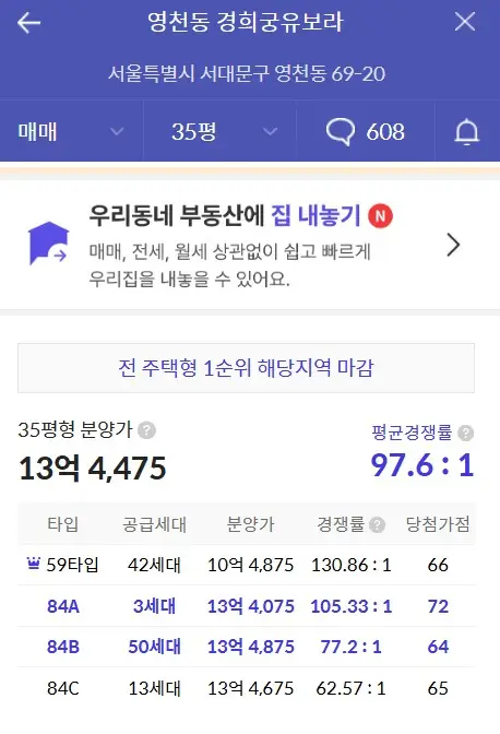 청약 경쟁률율도 거의 전용 84A 105:1이고 59 타입은 10억으로 130:1 당첨가점도 상당히 높네요.