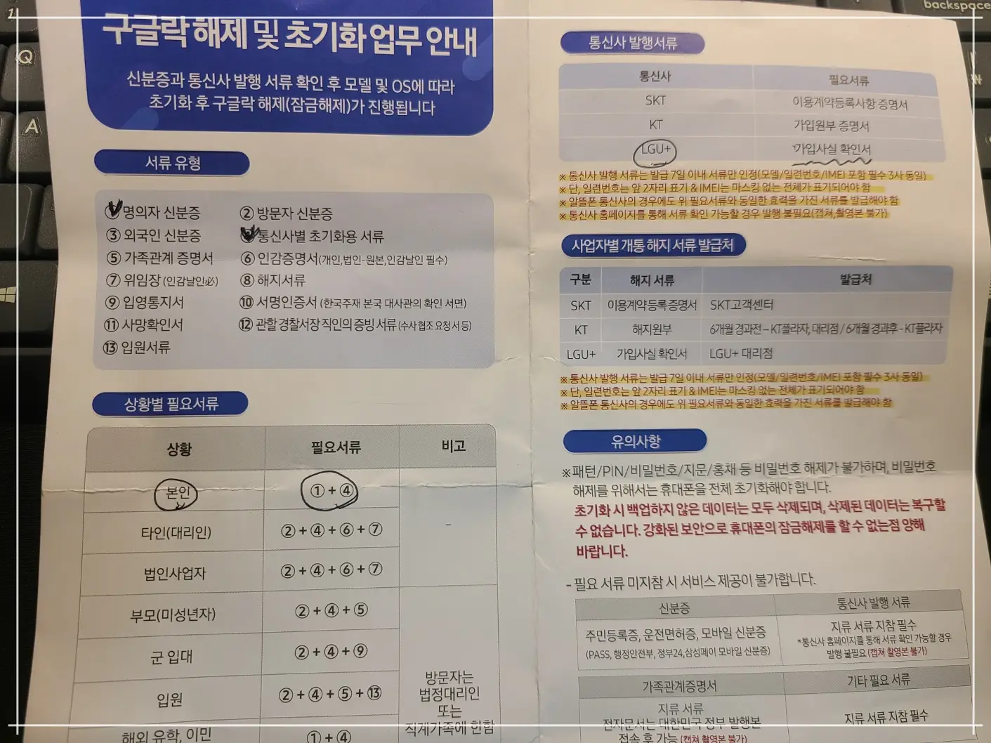 필요서류가 있다. 대리점 방문해야 한다.