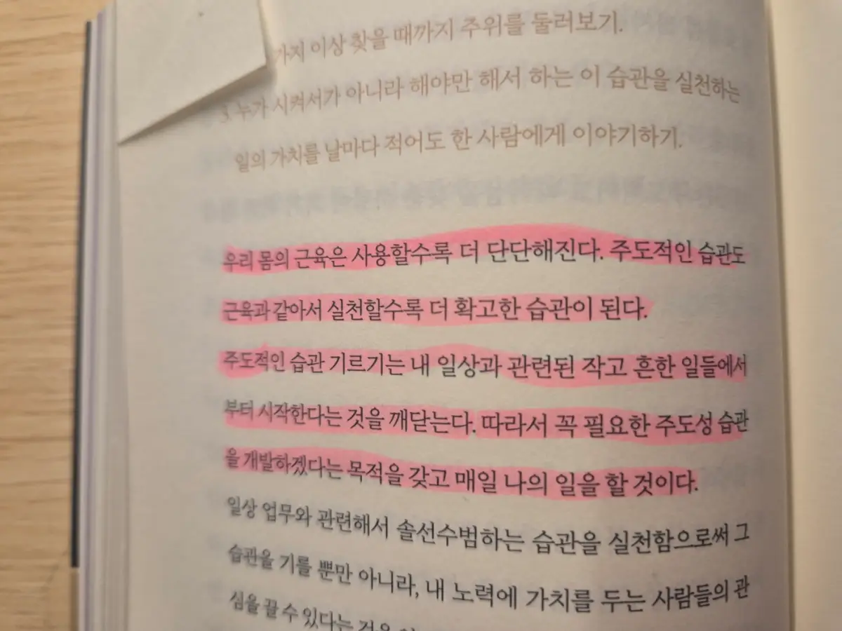 핵심:습관도 근육이다. 작은 일부터 실천할수록 단단해진다. 내가 먼저인 삶, 적극적으로 내 삶을 이끌어가는 주도적인 사람이 되겠다. 나는 할 수 있다.