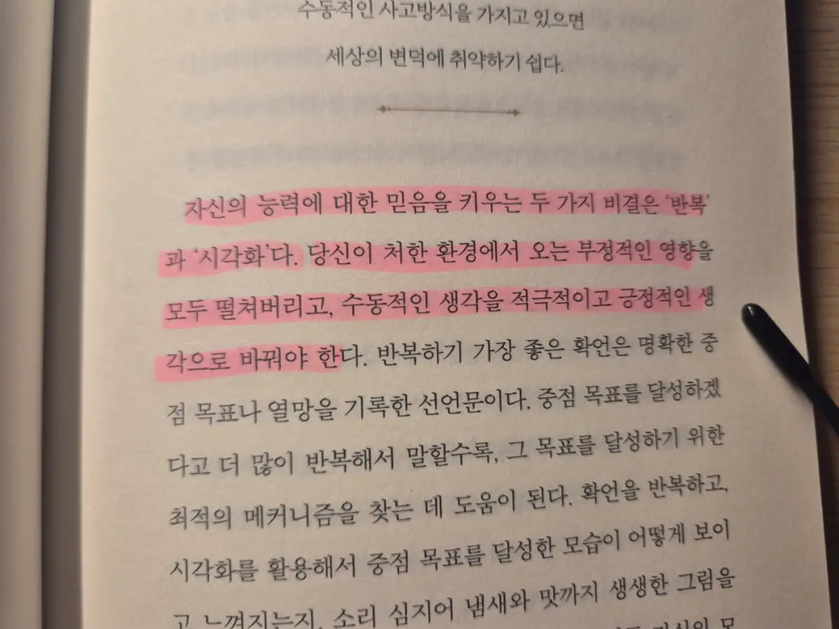 핵심 : 능력에 대한 믿음은 반복과 시각화에서 온다. 수동적인 생각을 긍정으로 바꾸는 힘은 루틴에서 나온다. 힘들어도 지키는 나만의 루틴이 나를 흔들리지 않게 한다.