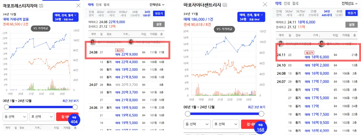 최근 거래 내역에서 볼 수 있듯이 마포구 신축아파트와 마래푸는 34평 전용 84가