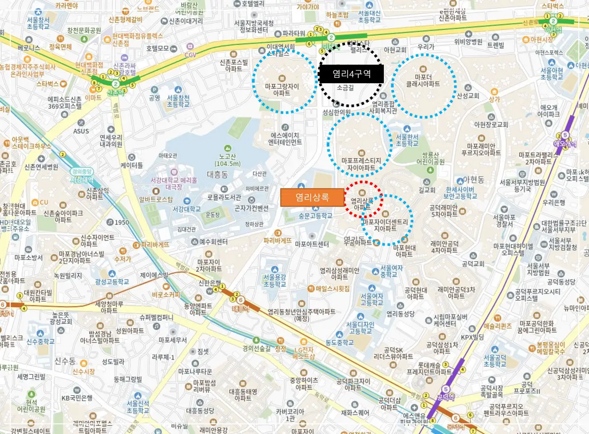 지도를 보시면 염리 4 구역은 재개발 단계로  좌우로 신축 아파트가 있습니다. 2호선 역세권입니다.  서울에서 몇 호선을 이용할 수 있느냐도 중요합니다. 나만 좋아하는 것이 아니라 다른 사람들도 모두 선호해야 합니다.