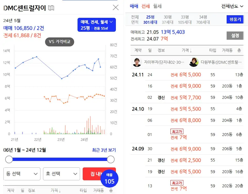 25평형이 최고가 13억 중반까지 고점을 찍었다. 신축에 교통이 좋으니 사람들이 좋아하는 것 같다.