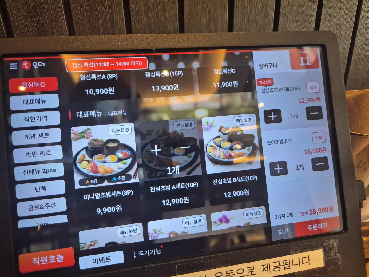 키오스크를 보시면 대표 메뉴로 진심초밥 세트가 있어서 주문해 보았습니다. 점심 특선보다는 가격이 나가지만 조금 아주 더... 대표 메뉴라는 말에 혹 해서 주문했습니다.