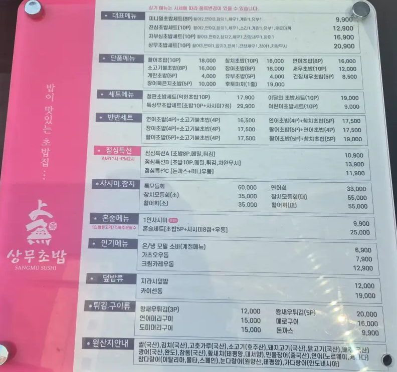 | 오마카세 초밥 세트 | 26,900원 | 광어, 도미, 연어, 새우 등 초밥 14피스 |