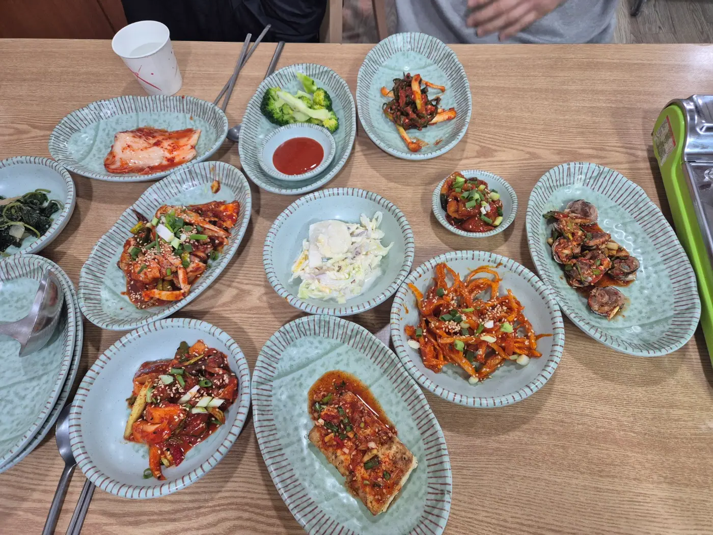 바뀌지 않은 것은 꼬막, 진미채, 김치, 셀러드는 고정인 거 같고요. 그때마다 젓갈이나 김치도 추가로 나올 때도 있었습니다.