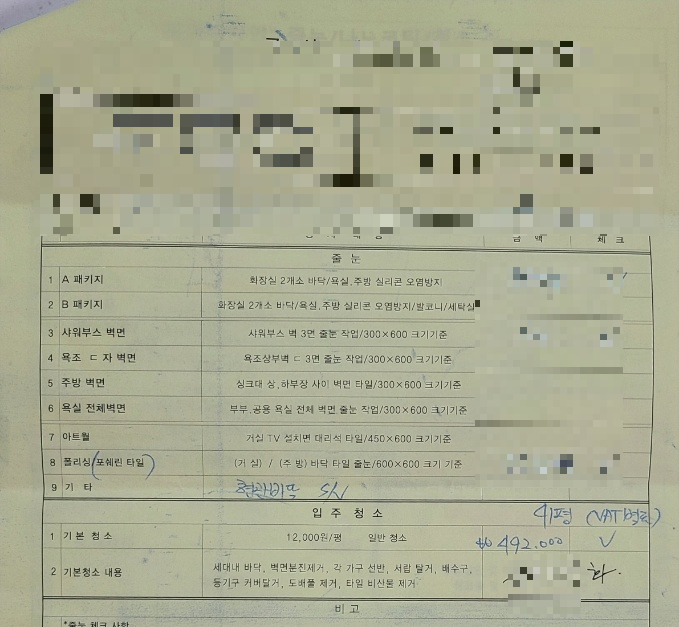 제가 받은 견적입니다. 저는 입주청소 외 추가적으로 줄눈까지 진행했습니다. 줄눈이 더 가격이 비싸요. 그래도 줄눈을 하면 확실히 청소하기가 수월합니다.