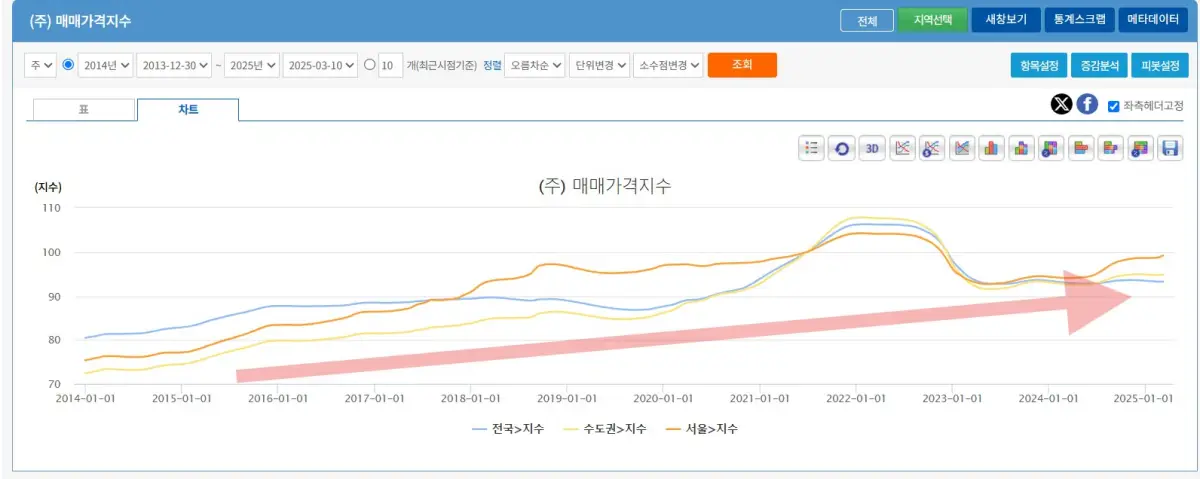 위 지표는 부동산통계 정보시스템에서 캡쳐 한 부분이다. 10년 전 아파트를 가지고 있으면 거의 대부분 상승했다. 어느지역 위치에 따라 다르겠지만 평균지표가 보여준다. 상승한다. 지금 비싸다고만 생각하지 말고 내 집마련을 할 수 있는 능력이 된다면 반드시 해야 되는 것이다.