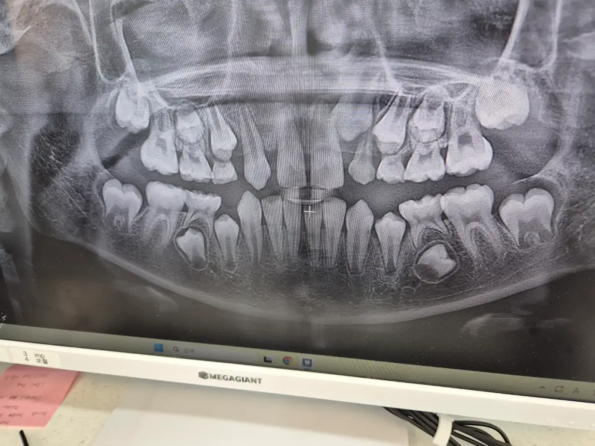 아이의 아래치아가.... 옆으로 자라고 있었습니다.