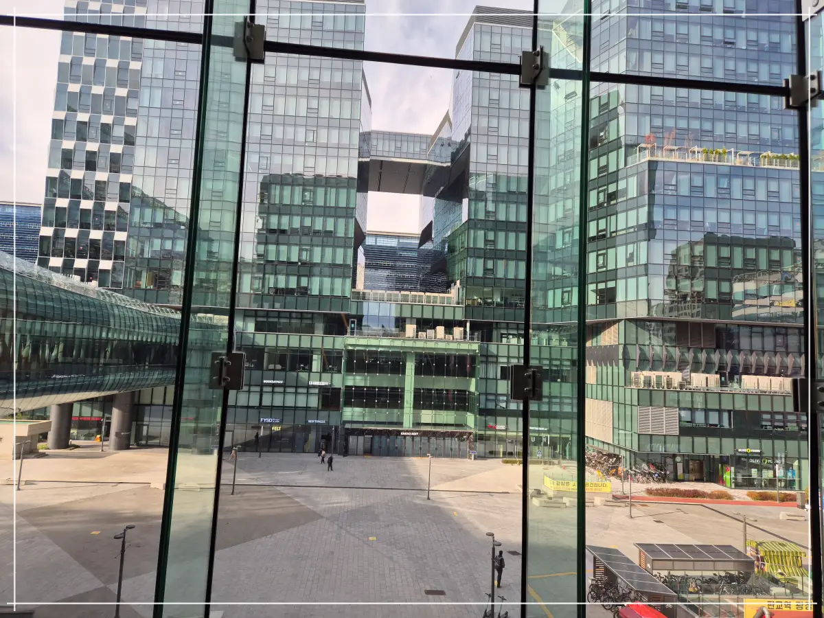 카카오 아지트에서 테크1 으로 연결되는 통로입니다. 건물 외벽들이 유리로 되었어 개방감이 너무 좋았습니다. 유동인구들도 대부분 젊은 20~30대 직장인들이 너무도 많이 있더라구요.