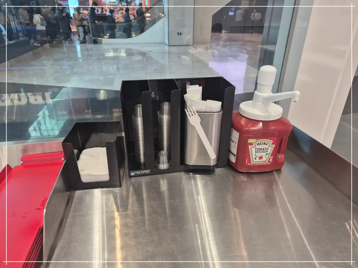 셀프로 케찹과 일회용 용기를 이용하셔요. 수제 버거 먹을 때 저는 손으로 들고 먹어서 손에 많이 묻히고 먹는데 그래도 그렇게 먹는 게 좀 맛있게 먹는 거라 생각이 들더라고요.
